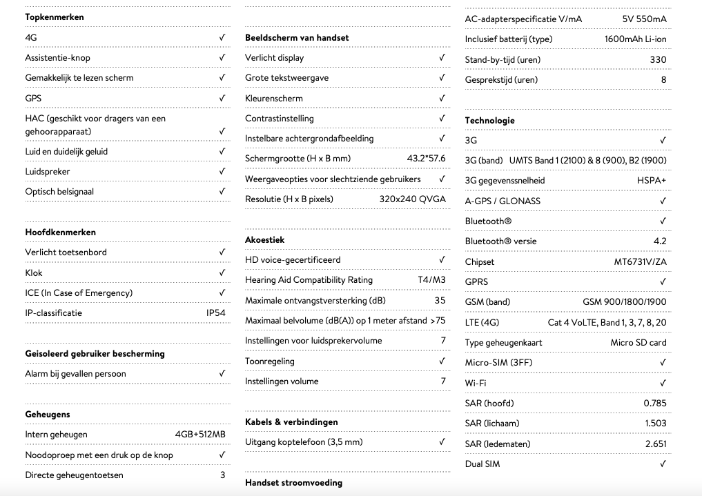 Deze duurzame en spatwaterdichte (IP54) mobiele telefoon biedt uitstekende bescherming voor geïsoleerde gebruikers dankzij waarschuwingsfuncties bij vallen en bewegingsloosheid en zelfactiverende alarmfuncties. Tevens met GPS-plaatsbepaling om mensen te laten weten waar u bent.